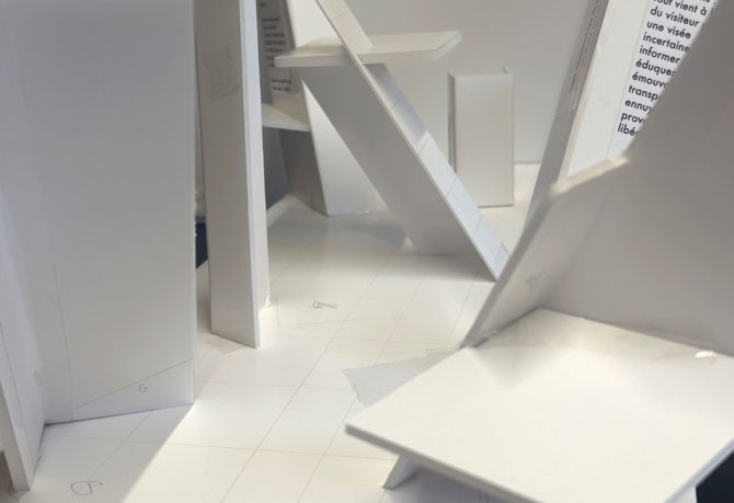 Jean Schneider est designer et scénographe d’exposition. À l’occasion de la parution d’un livre auto-édité sur vingt ans de travail, il fait de la Table un espace d’expérience entre architecture et texte. Il y présente des maquettes de mobilier et les éléments de construction de quelques expositions. Réinterprétant le travail d’Alexandre Vesnine, cette installation prend appui sur le vide pour donner présence aux formes, aux mots, à la lumière et rencontrer le visiteur.